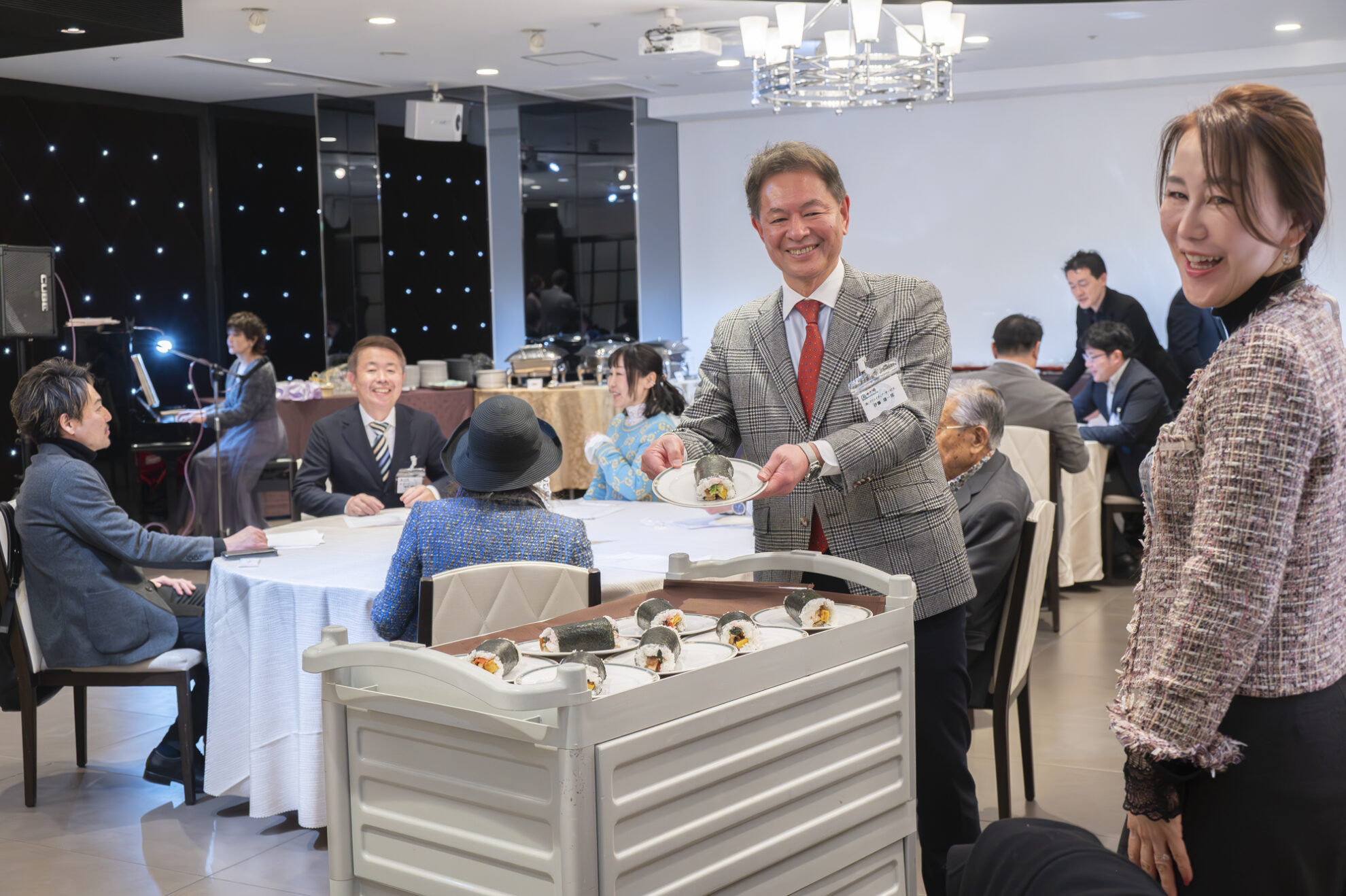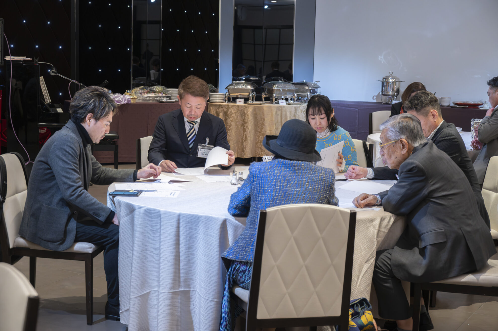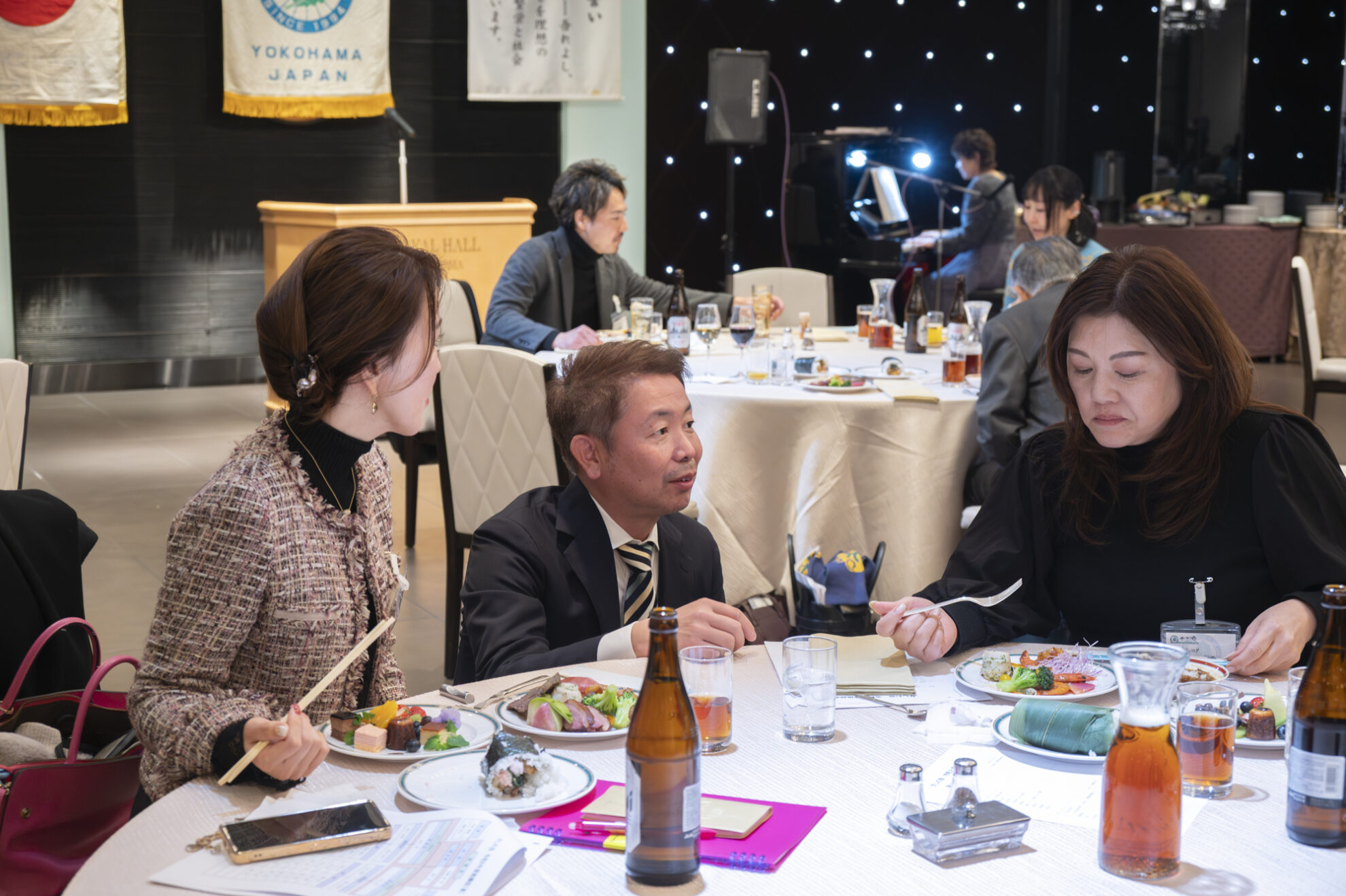 ピアノの生演奏を聴きながら、ホテルの美味しいお料理を食べつつ、会員同士の交流が行われました。
